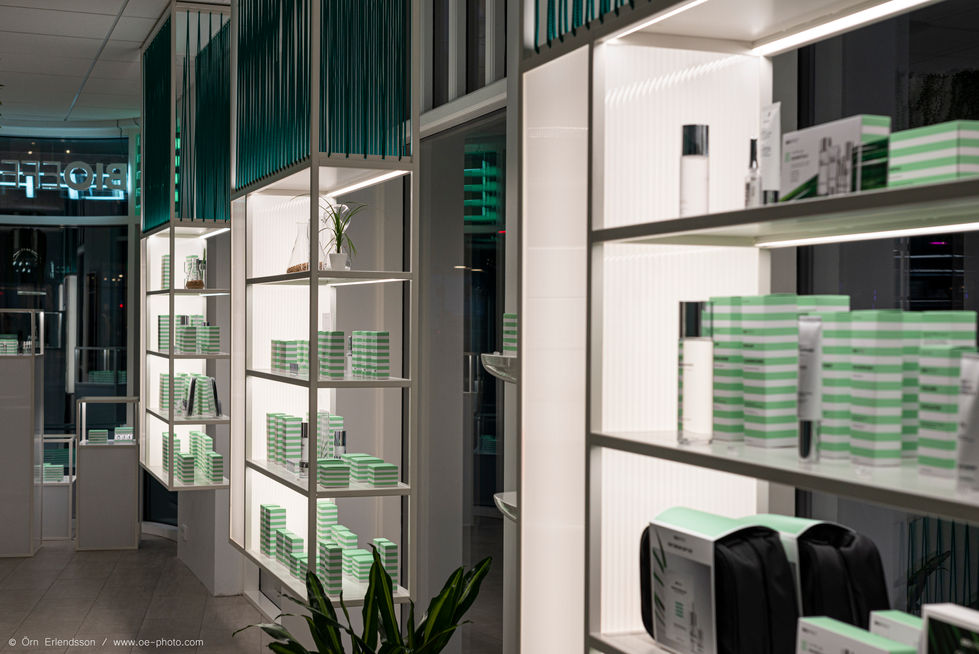 In the store, BIO Effect products are proudly displayed in the curved corner window, which is the building's most recognizable feature. Subtle lighting illuminates the products which are placed on top of several pedestals. Along the peripheral walls of the store, floating shelves host numerous BIO Effect products, testers and informative features related to the production process of the products. Gradient lighting is used to light up the eye-catching turquoise threading which is featured throughout the store. The floating shelves are visible both to ongoing pedestrians and visiting shoppers. The center piece of the store is a threaded table with gradient lighting. Above it, a floral crown aligned with LEDs provide comfortable lighting in the center of the store.